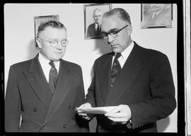 Photo caption accompanying published versions of 54-5548_001 and 54-5548_002 : "OPEN NEW CHURCH - The new Apostolic Church (top) [54-5548_001], Fifth avenue, Kingsdale, was officially opened yesterday, Michael Kraus (right) [54-5548_002], who dedicated the church, talks with pastor Rev. George Hendel, prior to the service."