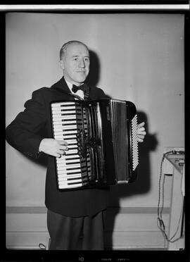 Image of Tom Arnold dressed in a tuxedo and standing with an accordion on chest. Arnold is seen looking off camera.