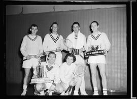 Photo caption from published version of 51-2235_005: "FEATURE IN FINALS - Some of the finalists in the third K-W International badminton championship which ended here yesterday are, kneeling (left) Don [Smythe], men's singles winner, Joan Warren, women's singles and mixed doubles victor. Standing, left to right, "Bunny" Brewster and George Thorpe, men's doubles finalists; Grant Henry and Lloyd Chandler, men's doubles winners. Henry also paired with Miss Warren in the mixed event."