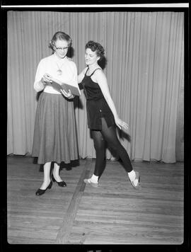 Photo caption from published version of 55-6910_002: "BALLET LORE - Miss Elsie Ewald (left) discusses ballet steps with her assistant, Mrs. Donna Mae (Moral) Wiese. They are preparing students for dance exams."