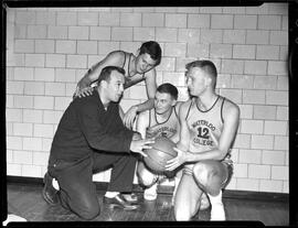 Photo caption from published version of 55-6936_002: "BIG CHORE - Waterloo College cagers face a big task tomorrow night as they take on Buffalo Erie Tech in their first basketball game against an American college. The Buffalo team has nine players over six feet tall. Waterloo coach Bob Celeri (left) talks over strategy with three of his players (left to right) Glen Biederman, Don Powell and Ross Pirie. Game time is 8 p.m. at the KCI gym."