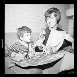 Image of Anne Dagg seated on a couch smiling at son, Hugh, while holding a giraffe figurine and a photo of giraffe. On their laps is a Zulu shield topped with more figurines.