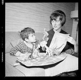 Image of Anne Dagg seated on a couch smiling at son, Hugh, while holding a giraffe figurine and a photo of giraffe. On their laps is a Zulu shield topped with more figurines.