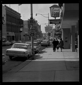 Images of King Street west, Kitchener. Pennsylvania Kitchen restaurant; Dunnette Jewellers; Waterloo Trust and Savings; Walker's Capitol theatre storefronts visible.
