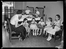 Group of children seated and two sitting up in hospital beds playing musical instruments while a female adult looks on.