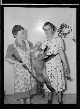 Caption from published version of 51-2590_001: "CHICKEN THIEF - This fox was bagged by Miss Vera Hamacher (left), Wilmot Centre, as he ran away with a chicken. Her cousin, Mrs. Harry Hostetler, was helping dress chickens."