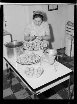 Images of canning preparations and cellar shelves stocked with jars of preserved foods.
