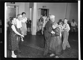 Photographs of people dancing, entertainers, and a visit from Santa Claus taken during a Christmas event at the House of Refuge.