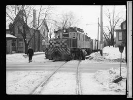 Caption from published version of 53-4846_001: "DERAILED BY ICE - Ice-clogged tracks caused the derailment of a Grand River Railway train today at the Queen St. South crossing. Fortunately it was travelling at a low speed and managed to come to a quick stop."