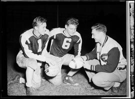 Photo caption from published version of 51-3054_003: "MEET CHAMPS TOMORROW - Three members of the K-W Panthers junior O.R.F.U. team, who play Windsor A.K.O., defending champions, here in an afternoon game tomorrow are shown here. Left to right, Henry Holdenmeyer, quarterback, Ed Quantz, high-scoring backfielder, and coach Claude Gregg. Kickoff for the opening junior game is timed for 3 p.m."
