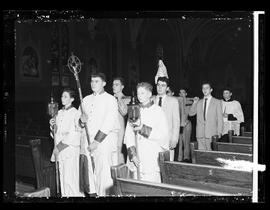 Photo caption from published photo: "MARK ANNIVERSARY - The solidality of St. Jerome's High School today celebrated its 10th anniversary. Led by members of the executive a procession was held from the school to St. Mary's RC Church where high mass was offered. Left to right are Rudy Molinary, Michael Myroniuk, Bernhard Fritz, John Weishar, William Kennedy, Nick Rintche (partially hidden), Terrance Flynn, Anthony Firetto and Rev. Theodore Sobisch."