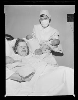 Photo caption for published version of 54-6565_001: "SEEING DOUBLE - Nurses at St. Mary's Hospital were seeing double yesterday when two sets of twins arrived. Mrs. Fritz Boegli of Kitchener holds her twin son and daughter while nurse Susan Neu of Preston holds son and daughter of Mr. and Mrs. James McCrudden, 344 Hespeler St., Preston".