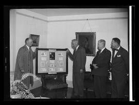 Photo caption from published version of 54-6570_001: PRESENT STAMP DISPLAY - The K-W Philatelic Society yesterday presented a collection of stamps of the late W.L. Mackenzie King to the Woodside Trust committee. Left to right are Bruce E. McAdam, presenting the display to J.H. Schofield, while John R. Watson and H.W. Wagner look on."
