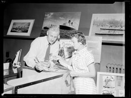 Photo caption from published version of 54-6619_002: "EXPLAINS LINER LIFE - Steamship travel consultant James Beckett discusses passage classes, customs and rates with Mrs. Donald Oberholtzer. More people are going abroad this year than in Coronation Year the local agents report."