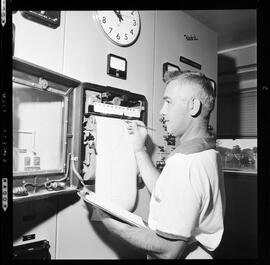 Images of an unknown individual with a printout in a room full of what appear to be gauges.
