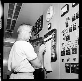 Images of an unknown individual with a printout in a room full of what appear to be gauges.