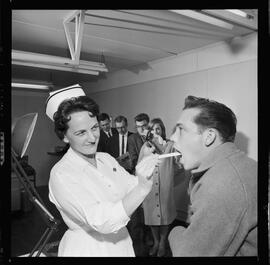 Image of Phyllis Livingston examining a student's mouth with a tongue depressor as others waiting in line look on.