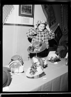 Photo caption that accompanied both photos: "CRAFTS SHOW - Unique exhibits feature the second annual arts and crafts exhibit sponsored by the Waterloo Recreation Commission. Photo above [missing from envelope, no suitable substitute] shows people wearing special colored glasses through which they see three-dimensional films. In the photo below [53-5370_001] Mrs. William Otto is trying on a spring bonnet at the millinery display."